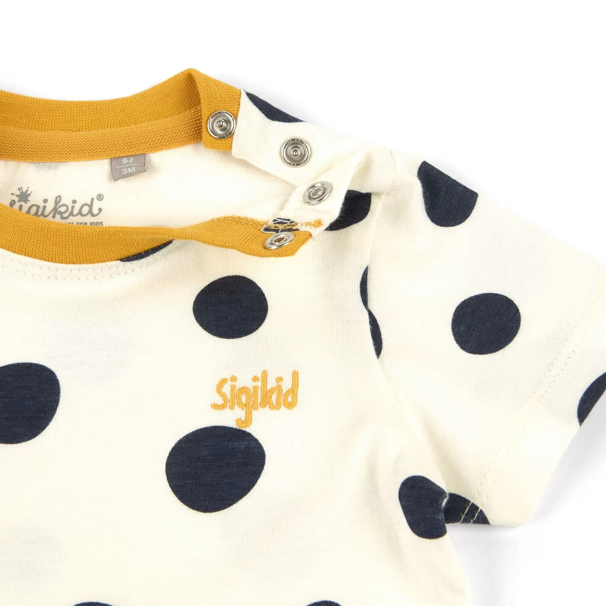 Dieses Frisch-Fröhliche Baby T-Shirt Macht Zusammen Mit Seinem Spielanhänger Dem Namen Der Kollektion Alle Ehre: Tupfen Pony! Das Cremeweiße Sommershirt Für Kleine Mädchen Ist Mit Dunkelblauen Tupfen Bedruckt Und Trägt Eine Kleine Sigikid Stickschrift So Gelb Wie Das Softe Halsbündchen. Qualität: Weicher Singlejersey Aus K.B.A.-Baumwolle.